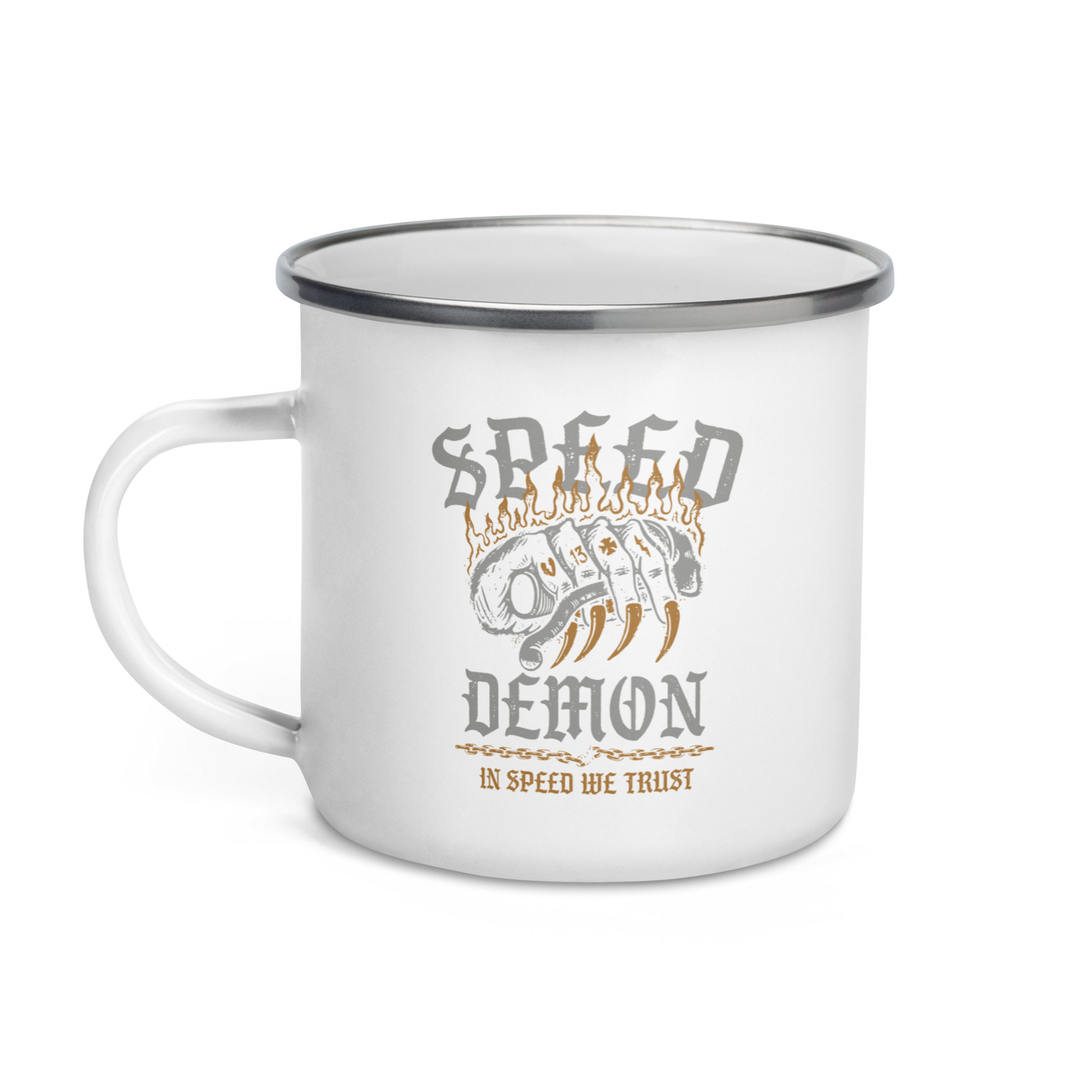 A must-have for any camper, the Speed Demon - Enamel Mug offers lightweight, durable and versatile use. Perfect for sipping on your favorite beverage or enjoying a hot meal while on a hike, it can also be attached to your bag for quick and easy access.